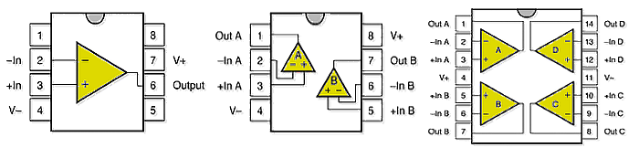 Most Op-Amps are packed into an Integrated Circuit (IC) chip. These chips bring the signal and power lines out to pins that attach it to the printed circuit board. The most common arrangements are single, dual and quad packages: