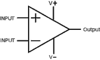 The schematic symbol for an op-amp is shown on the right. As you can see, there are two inputs. The one marked plus does not invert; feeding a positive input here will result in a positive output. The one marked minus is an inverting input; if you feed it a positive voltage it will appear on the output as a negative voltage. It's a clever design that lends itself well to a huge number of applications.