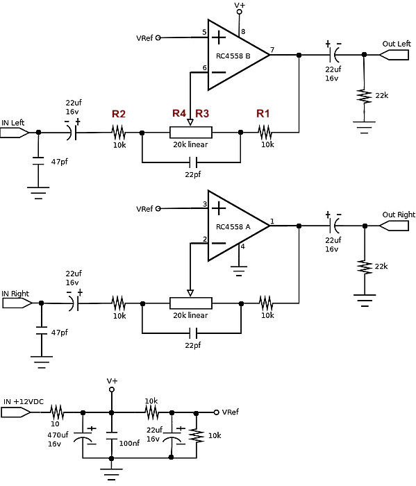 Of course the real world is more complex than the basic configurations above. But, the core principles of operation remain the same. More complex configurations using capacitors as well as resistors can give you tone controls, high and low pass filters, balanced audio decoders and a whole lot more.As a simple example you can actually build and use, here is a line level adjuster. It features about 10db (voltage gain of 3) of boost or cut, so you can adjust the input level to a device that is over or under driven.